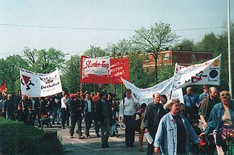 Neulich war mal wieder 1. Mai, auch Tag der Arbeit genannt. Alles, Demo, Kundgebung und Volksfest mit Kinderkarussel, Propagandaständen und Würstchenbuden, fand bei sommerlicher Temperatur unter blauem Himmel mit strahlendem Sonnenschein statt. So war es richtig nett, man traf sich mal wieder (frau natürlich auch). Früher, im Gefolge der 68er-Bewegung, als in Kiel Lehrlinge und StudentInnen und die damals entstehenden K-Gruppen dafür gesorgt hatten, daß der DGB den 1. Mai nicht mehr länger als Gedenktag im Legiensaal abfeierte, sondern auf die Straße ging, wurde dieser Tag (wieder) zum "Kampftag der Arbeiterklasse" erklärt. Das war für die damalige Gewerkschaftsführung sehr, sehr unbequem, und sie reagierte schließlich auf solche und ähnliche Störungen (z.B. die Besetzung des Gewerkschaftshauses) mit Anwendung des Unvereinbarkeitsbeschlusses, was etliche Ausschlüsse zur Folge hatte. |