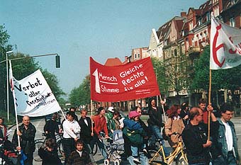 Doch zurück zum Wahlkampf unserer Landesmutter am 1. Mai und zu ihrem lammfrommen Publikum. Heide Simonis sorgt sich um den Anstieg der Lohnnebenkosten und lastet ihnen an, daß die Arbeit teurer und die Arbeitsplätze weniger würden. Als der 1. Mai noch Kampftag der Arbeiterklasse hieß, hätte das ein Pfeifkonzert ausgelöst, denn damals war den versammelten Linken noch geläufig, daß es sich bei den sog. Lohnnebenkosten um nichts anderes handelt als um einbehaltenen Lohn, und sie hätten kaum geduldet, daß man oder frau ihnen am 1. Mai durch die Blumen Lohneinschränkungen nahelegt. Daß dagegen bei dieser Wahlveranstaltung für Schröder auch unsere Mitbürger ohne deutschen Paß relativ leise demonstrieren und beim anschließenden Volksfest nicht mehr zu sehen sind, versteht sich wegen der Schröderschen CSU-Sprüche über "kriminelle Ausländer" schon fast von selbst. Und auch die Handvoll anwesender Arbeitsloser, denen die Gewerkschaftsbürokratie einen eigenen Redebeitrag verweigert hatte, hält sich taktvoll zurück.