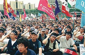 Neben den persönlichen Schwierigkeiten schlägt den sehr nationalistischen Koreanern v.a. der Ausverkauf ans Ausland auf den Magen. Bei der KFPSU, einem KCTU-Mitgliedsverband für den öffentlichen Sektor, empört man sich, daß strategisch wichtige Unternehmen verkauft werden sollen, nur um Schulden zu bezahlen. "Die öffentlichen Unternehmen sind mit Steuergeldern und dem Schweiß der Arbeiter aufgebaut worden", heißt es in einem Protestbrief an Präsident Kim. "Betriebe wie Telekommunikation und Stromerzeugung sind Schlüsselindustrien, doch die Regierung will sie an ausländisches spekulatives Kapital für wenig Geld verkaufen, nur weil sie im Augenblick Dollar braucht, um die Schulden zu bezahlen." Dafür sei man nicht bereit, Opfer zu bringen.
