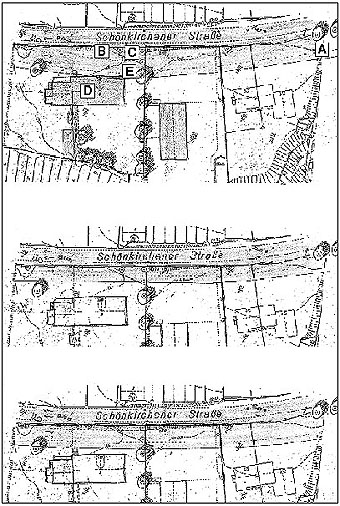 Oben: Planung der Stadt, bei der alte Kastanien (A) der Straße geopfert werden, geschädigte Bäume (B) aber stehengelassen werden, bei der eine sinnlose Verbreiterung des Mittelstreifens (C) dazu führt, daß die historisch wertvolle Schwentine-Schule (D) minimal vom Rad- und Fußweg (E) berührt wird und deshalb abgerissen werden soll.