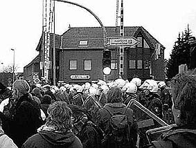 Vor dem BI-Büro in der Innenstadt hat die Ordnungsmacht Logistik-Probleme. Sie kann ihre Einheiten nicht so schnell verschieben, wie sie es gern hätte, weil der Zebrastreifen von Fußgängern benutzt wird stundenlang. Nachdem es hier zunächst zu Appellen an die "Vernunft" der Fußgänger gekommen ist ("Ihr könnt doch wählen gehen"), gibt es schließlich was auf die Mütze von hinten ist Verstärkung aus Berlin angerückt. Währenddessen gehen die symbolischen Geplänkel auf den Gleisen weiter. Niemand fügt dem Schienenstrang irgendeinen Schaden zu. Die Toten Hosen improvisieren ein Konzert auf einem LKW. Als dieser nahe genug an den Bahnübergang herangeschoben worden ist, daß die BGS-ler Campinos Bartstoppeln erkennen können, kommt es zu einer deutlichen Mißfallskundgebung: Die Scheiben des LKW werden in staatlichem Auftrag zertrümmert, die Reifen durchstochen.