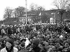 Freitag, 20.3., 8.00 Uhr: Langsam versammeln sich einige Hundert Demonstranten an der Marienkirche zu einer Kundgebung. Die Cafés und Bäckereien in der Umgebung des Platzes machen einen einmaligen Umsatz. Als Gegenleistung müssen sie ihre Toiletten zur Verfügung stellen. Die Kundgebung muß zunächst ohne Lautsprecher und Megaphon auskommen angeblich Teil der Vereinbarung zwischen Anmeldern und Staatsmacht. Deswegen kann die Information über eine gerade stattfindende Sitzblockade am Bahnübergang Schorlemmerstraße nur auf Rufweite weitergegeben werden. Dafür gibt es die üblichen T-Shirts, Sticker und Aufkleber zu kaufen der Dealer stammt aus dem Wendland. |