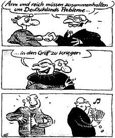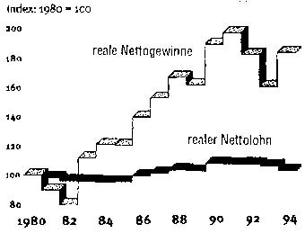 Der seit Jahren wachsende Reichtum in der BRD ist angesichts wachsender sozialer Probleme nicht nur ein politischer Skandal, sondern auch gleichzeitig Ursache der Probleme, da der in großen Geldvermögen angestaute Reichtum keine neuen Arbeitsplätze schafft. Im Gegenteil nimmt das Heer der Arbeitslosen und Armen zu und stagnieren die Arbeitseinkommen, verlegt sich das Kapital auf Spekulationsgeschäfte und weicht auf andere Märkte aus. Die spektakulärste "Profitentwicklung" fand in den letzten Jahren auf den Aktienmärkten statt. Seit 1996 hat sich der Aktienindex um über 100% erhöht. Der Vermögenszuwachs bleibt übrigens steuerfrei, solange die Aktien nicht innerhalb eines halben Jahres erneut verkauft werden. Die privaten Geldvermögen haben sich seit 1985 fast parallel zu den Ausgaben der Sozialhilfe entwickelt. Mehr als 5 Mio. Menschen leben in der BRD unterhalb der Armutsschwelle. Anfang 1996 beanspruchten 2,52 Mio. Sozialhilfe. Ihre Zahl hat sich seit 1973, dem letzten Jahr der "Vollbeschäftigung", um 370% erhöht. Besonders dramatisch ist die Situation für Kinder und Jugendliche. 1995 bezogen 936.000 Kinder Sozialhilfe. Zur privaten Armut gesellt sich die öffentliche. Die Staatsschulden haben sich seit 1990 annähernd verdoppelt und betrugen 1997 bereits 2.217 Mrd. DM. Auf die gleiche Weise wie die Armut wächst, sinken die für die Armutsbekämpfung notwendigen Mittel zugunsten der durch die Bundesregierung betriebenen Umverteilung von unten nach oben, da die Staatsschulden zum größten Teil auf die Steuergeschenke für Kapitalisten und Reiche zurückgehen. Wäre der Anteil der Gewinnsteuern am gesamten Steueraufkommen heute so groß wie 1980, hätte der Staat gut 100 Mrd. DM pro Jahr mehr in der Kasse gehabt. Die Steuergeschenke wurden mit Einsparungen bei den Sozialausgaben bezahlt. 1997 wurden Sozialausgaben in Höhe von DM 130 Mrd. eingespart. Der Anteil der Sozialleistungsquote, d.h. der Anteil aller Sozialleistungen am Brutto-Inlandsprodukt betrug 1995 31,2%. 1975 waren es, ohne Massenarbeitslosigkeit, 33,9%. Das widerlegt auch die Sprüche von zu hohen Sozialausgaben. Die Verluste betreffen aber nicht nur die "Schwächsten" in dieser Gesellschaft, auch die ArbeitnehmerInnen sind betroffen. Die realen Nettolöhne gingen von 1991 bis 1996 um 6,7% zurück, die Beitragssätze der Sozialversicherungen stiegen im gleichen Zeitraum von 35,2% auf 42,1% , während die Gewinne der Kapitalisten erheblich stiegen. Die Positionen der Selbständigen im Verhältnis zum durchschnittlichen Bruttoeinkommen aller Haushalte erhöhte sich seit 1990 um 120,9%. Die Lohnquote sank auf den Stand der 60er Jahre. Die Zahl der Einkommensmillionäre hat sich von 1982 bis 1992 mehr als verdoppelt.(1983: 10.318, 1992: 24.975) 1988 verfügten 10% der Bevölkerung über die Hälfte des Netto-Geldvermögens. Die 95 reichsten Deutschen besitzen genau so viel wie 17,5 Mio. deutsche Haushalte mit 41 Mio. Menschen! |