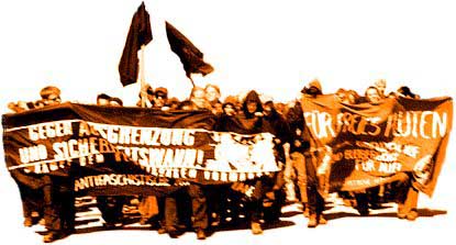 Grenzcamp '99: Shut down fortress Europe!Die hier vorgestellte Veranstaltungsreihe ist Teil der Mobilisierung zum deutsch-dänischen Grenzcamp, welches vom 6. bis 8.8. in Flensburg stattfindet. Organisiert von einem Bündnis antirassistischer/antifaschistischer, linker Gruppen wird das Camp zeitgleich mit anderen Aktionen in Europa und an der mexikanisch-amerikanischen Grenze stattfinden. Geplant sind vielfältige Aktionen in Flensburg sowie in Grenznähe, auch unter Beteiligung dänischer AntirassistInnen. Gemeinsam wollen wir Perspektiven gegen das Europa der Reichen entwickeln und theoretisch sowie praktisch unsere Vorstellungen von einer Welt ohne Ausbeutung und Grenzen der Öffentlichkeit präsentieren. Weitere Infos zum Grenzcamp gibt's unter http://www.nadir.org/grenzaktion. |