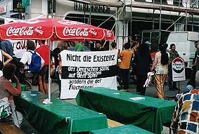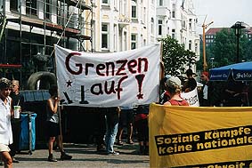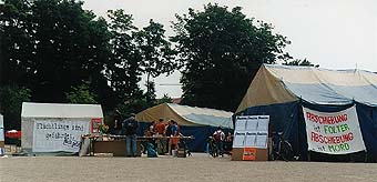 Am Plenum zum Tagesauftakt am Samstag nahmen dann bereits über 100 Menschen teil. Die meisten davon machten sich zu einer Demonstration in die Innenstadt auf. In T-Shirts mit einem dem BGS-Emblem ähnlichem Abzeichen auf der Vorderseite sowie der rückwärtigen Aufschrift "Menschenjäger" wurden "Vorläufige Aufenthaltsgenehmigungen" an die Passanten und die Shopping-Gesellschaft verteilt. An der Gebäudefassade einer Kaufhauskette wurde das Transparent "kein Mensch ist illegal" heruntergelassen. Leider kam es im Anschluss an diese Aktion zu Auseinandersetzungen mit der Polizei, die sich, u.a. gestört vom Ausspruch "Menschenjäger", auf einen Kameramann aus dem Camp stürzte, diesen mit sich schliff und ihn sowie drei weitere Personen festnahm. Bei diesem Überfall zerbrach auch die Kamera, der Film jedoch gelangte nicht in die Hände der Polizei. Nach kurzer Zeit wurden die vier Leute wieder freigelassen. |