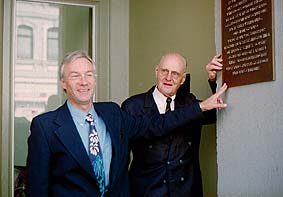 Kulturdezernent Rethage und Hartmut Schulze-Boysen (Bruder des Widerstandskämpfers) bei der Enthüllung der Gedenktafel am Haus Feldstraße 68 (Foto: jm) |