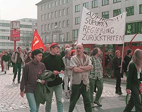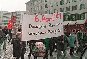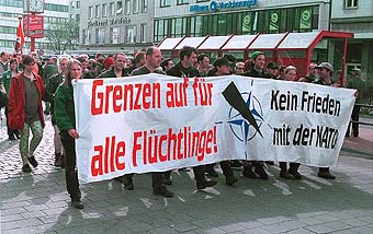 Am Ostersamstag (3.4.) demonstrierten in Kiel ca. 450 Menschen gegen den Angriffskrieg der NATO auf Jugoslawien. Die Demonstration begann mit einer Kundgebung auf dem Asmus-Bremer-Platz und führte dann u.a. zu den örtlichen Parteizentralen von SPD und Grünen. Um das Verhältnis zu den Grünen nach deren Unterstützung des NATO-Bombardements hatte es im Bündnis, das die Demonstration veranstaltete, z.T. harte Auseinandersetzungen gegeben. Noch zu merken war dies in den Redebeiträgen. Ein Sprecher der Initiative "Kein Frieden mit der NATO" griff die Grünen scharf an und verbat sich das "unkommentierte Zeigen von Symbolen der Grünen", da dies einen Affront gegen die Demonstration bedeute. Andere Redner hingegen riefen dazu auf, jene Kräfte bei den Grünen, die sich gegen die neue Politik ihrer Partei wehren, zu unterstützen. Einig waren sich alle RednerInnen, daß es sich beim Vorgehen der NATO um einen eindeutig völkerrechtswidrigen Akt handelt, u.a. weil ein Mandat der UNO fehlt, und daß der Bombenterror gegen Serbien die Lage der Flüchtlinge im Kosovo noch verschärft, bzw. die Angriffe von paramilitärischen serbischen Polizeieinheiten auf die albanische Bevölkerung im Kosovo eher begünstigt, denn verhindert habe. Eine Lösung des Konflikts könne nicht herbeigebombt werden. Ferner wurde insbesondere die deutsche Beteiligung an den NATO-Angriffen scharf kritisiert. Knapp 58 Jahre nach dem Angriff von Görings Luftwaffe auf Belgrad (6.4.1941) seien es wiederum deutsche Flugzeuge, die die jugoslawische Hauptstadt bombardierten. Zur Salamitaktik, die Bundeswehr von ihrem ursprünglichen verfassungsmäßigen Auftrag der Landesverteidigung immer mehr zu einer international agierenden aggressiven Interventionsarmee zu machen, fehle jetzt "nur noch die letzte Scheibe", daß auch deutsche Bodentruppen eingesetzt würden. Kritisiert wurde auch die "heuchlerische Doppelmoral", einerseits zu bombardieren, andererseits aber die Schranken für Bürgerkriegsflüchtlinge aus der Region an den deutschen Grenzen (und denen der EU) besonders hoch zu legen. Eine der Forderungen war daher auch "Grenzen auf für alle Flüchtlinge!" Ein Sprecher der IG Medien wies überdies auf die einseitige Parteinahme gegen die Serben in der Berichterstattung deutscher Medien hin und rief JournalistInnen dazu auf, sich nicht zu Sprachrohren deutscher Kriegspropaganda machen zu lassen. Die Forderung der Demonstration nach einem sofortigen Stop der Bombardierungen sollte jedoch, darauf wies ein Redner von "Avanti - Projekt undogmatische Linke" hin, nicht als Parteinahme für Milosevic verstanden werden. Mit der Politik der jugoslawischen Regierung, Menschen aus dem Kosovo zu internieren oder sie gezielt zu vertreiben, wolle man sich ebensowenig gemein machen wie mit den Kriegstreibern der NATO. (jm) |